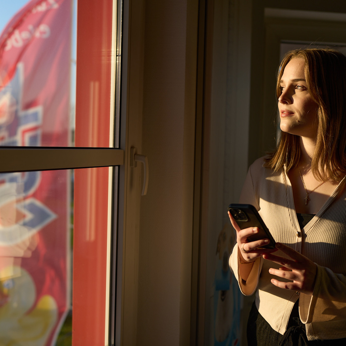 Dass Lea Häusler da ist, bemerken die Mitarbeitenden von fritz an der frischen Brise. Noch bevor sie sich den ersten Kaffee einschenkt, öffnet sie die Fenster. Der Tag startet mit frischer Luft. Und für Lea startet er besonders früh. Die Projektassistenz und Social Media Managerin kommt schon um sieben Uhr ins Büro. Dann ist außer der Geschäftsführung oft noch niemand da und sie kann die Ruhe genießen. In dieser Zeit arbeitet sie besonders produktiv. Als Projektassistenz im Fachbereich Sanitär kümmert sie sich um die Anliegen der Privatkunden. Ob Rechnungen, Angebote, Reklamationen oder Status Updates – alles läuft über Leas Schreibtisch.
